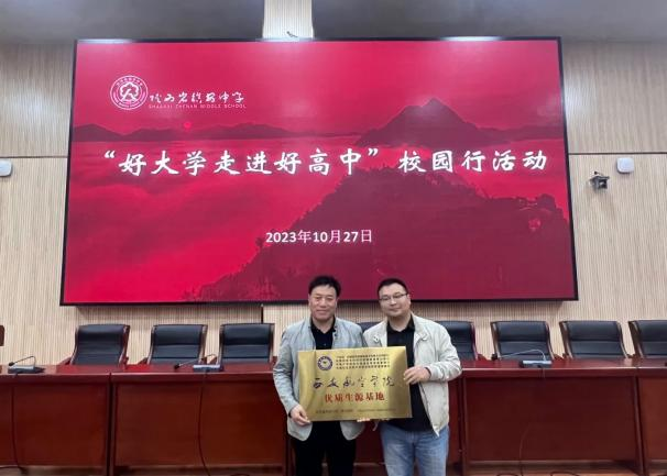 近日,万博官网联合西安电子科技大学、西北大学等省内10余高校开展“中学校园行”活动。各招生组及招办分别前往商洛市、咸阳市、汉中市等地的18所中学开展招生宣传工作,与中学校长和老师进行深度交流,举办多场宣传咨询活动,举行优质生源基地授牌仪式,共新建优质生源基地15个。
