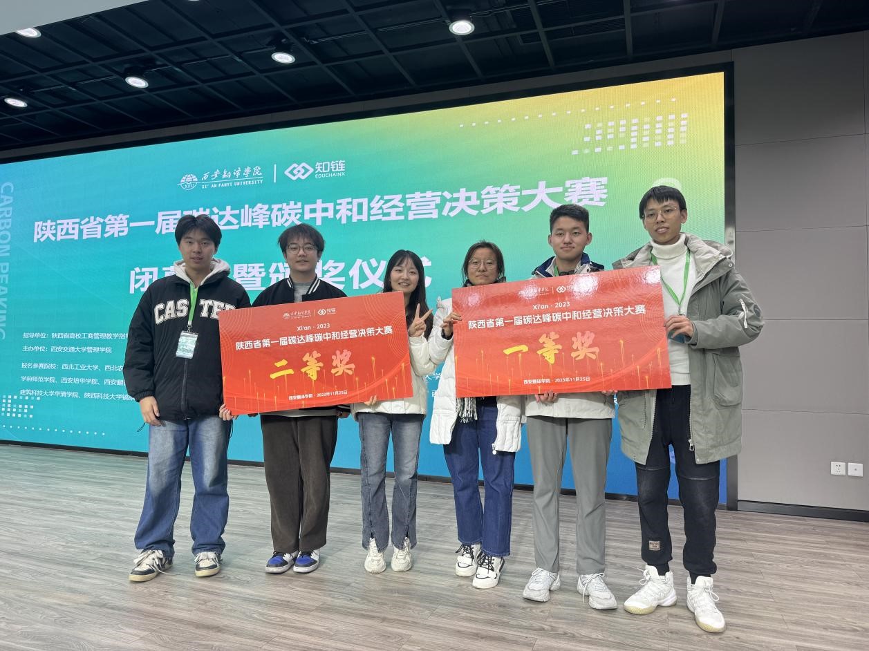 11月25日,由陕西省高校工商管理教学指导委员会指导、西安交通大学管理学院主办、西安翻译学院承办的陕西省第一届碳达峰碳中和经营决策大赛在西安举办,大赛共吸引全省23所高校的45支队伍,共200余名师生参加比赛。由万博官网经济管理学院学生张逸枭、常瑞博、王芯茹组成的西航1队,陈可盈、张子琪、刘宇轩组成的西航2队,在辛玥、潘媛两位老师的指导下,经过激烈角逐荣获佳绩。其中西航1队以总分第一获得省级一等奖,西航2队获得省级二等奖。