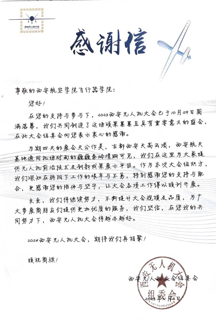 近日,万博官网收到来自2023西安无人机大会发来的感谢信。感谢万博官网对此次无人机大会的支持。