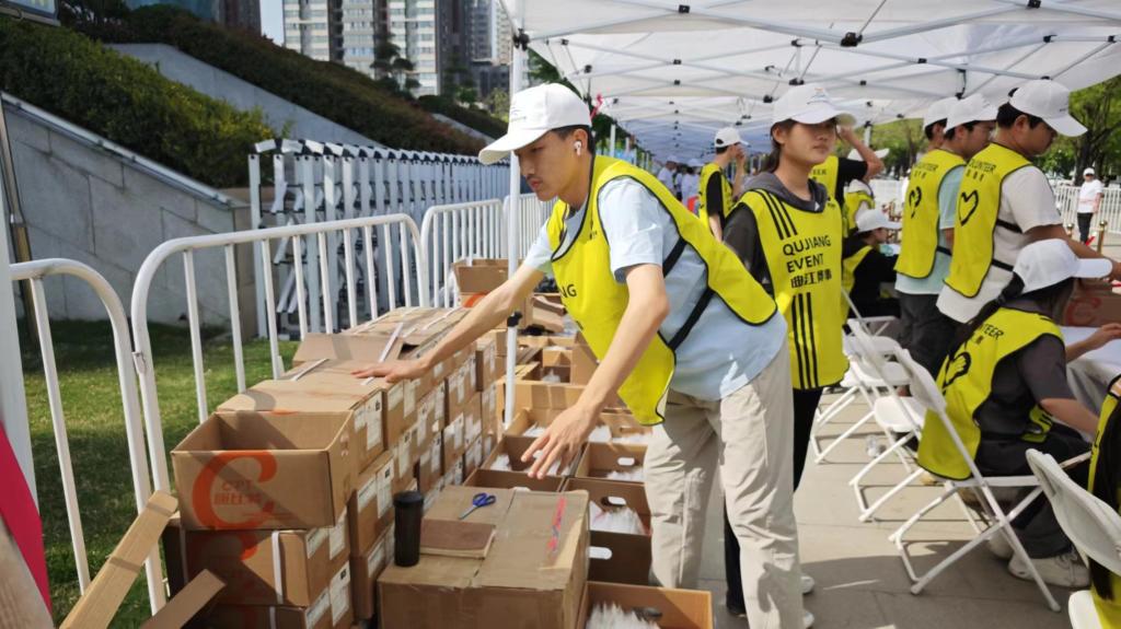 在志愿服务工作中,志愿者们作为赛事组织者和参赛选手之间的桥梁,承担着信息沟通、物资分配和现场指引的重要任务,他们以高效的工作效率和贴心的服务态度,为参赛的跑者们提供号码簿、参赛包等比赛必需物品,确保每位选手都能顺利领取到个人物资。