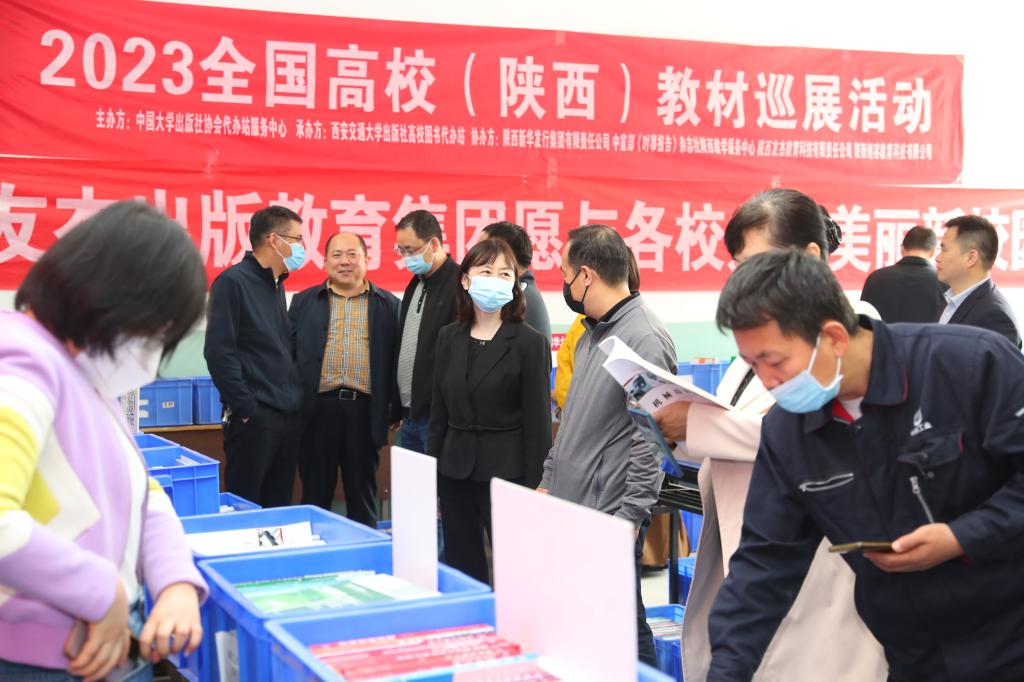 为做好2023年秋季学期教材选用工作,提高教材选用质量,5月11日,学校在莲湖校区举办了“2023年全国高校(陕西)教材巡展”活动,副校长金文、教务处处长谢辉等出席了活动。