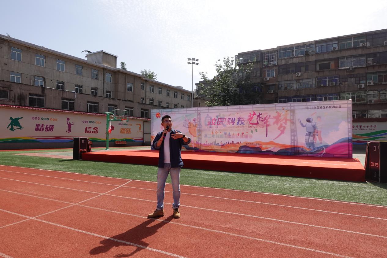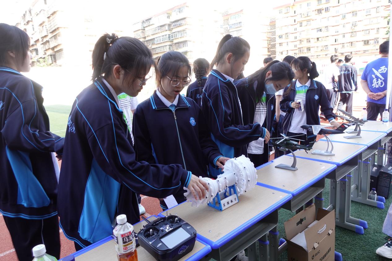 仪式上,梁毅辰老师为全校师生做了航空科普讲座,将航空知识、文化与日常生活紧密联系,点燃了同学们心中的航空梦想。航模队学生为师生们带来了板机特技飞行表演和纸飞机编队飞行表演,赢得了在场师生的阵阵掌声和欢呼。现场还为七十中师生带来了歼-20、歼-15、运-10、C919、轰6等飞机模型的静态展示以及阻力实验、平衡鸟、飞行模拟器等三个动态体验项目,为师生们详细讲解了飞机的飞行原理。